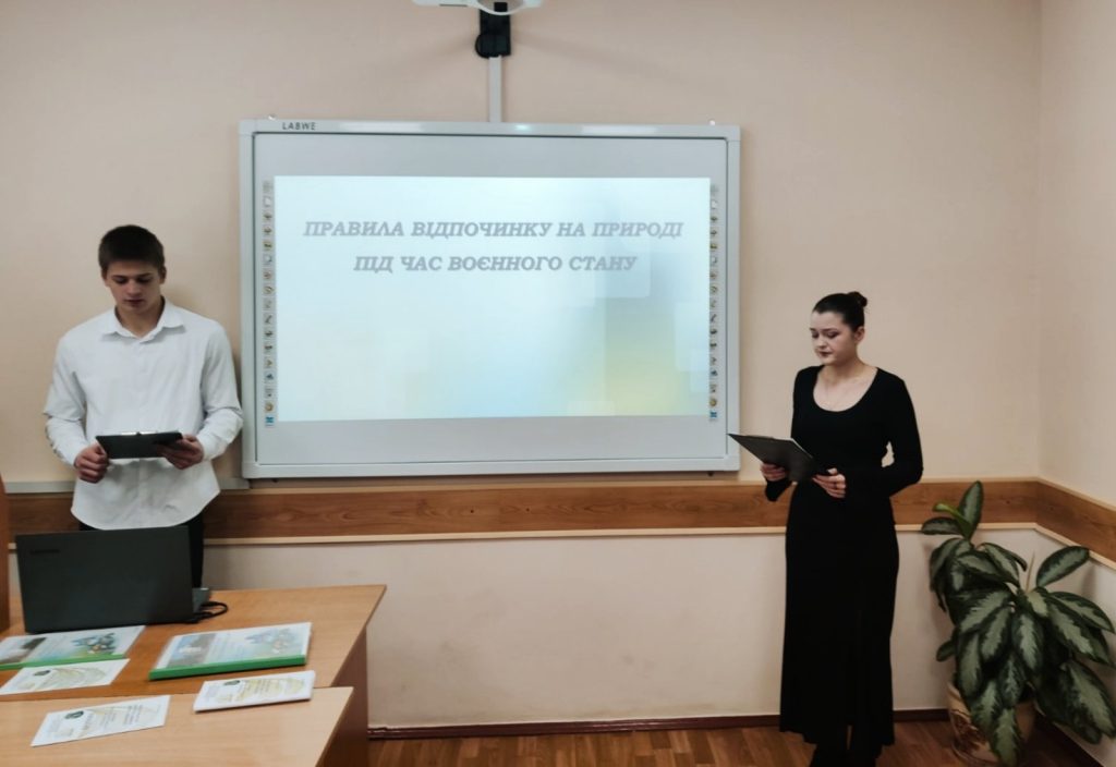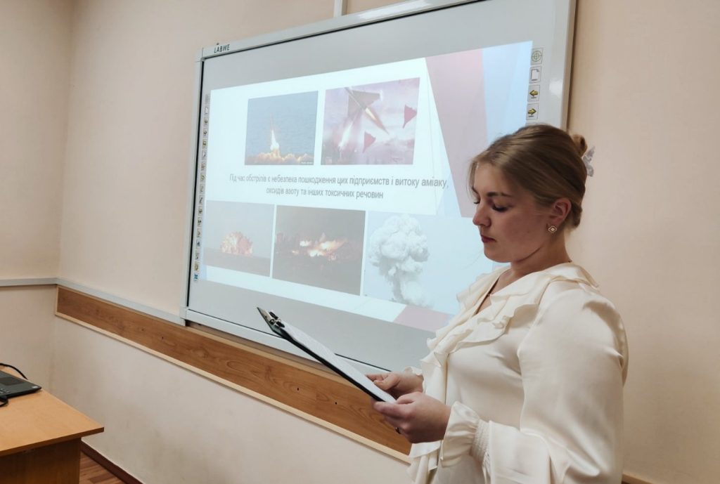 До Міжнародного дня запобігання експлуатації навколишнього середовища під час війни та збройних конфліктів екологічним гуртком Академії, керівництво якого здійснює завідувач кафедри природничих дисциплін, к.пед.н., доцент Олена Снісар, проведено відкрите засідання, на якому розглянуто актуальні екологічні проблеми нашої області спричинені війною. Здобувачі фахової передвищої освіти, що навчаються на ОПП Фармація Владислав Гордієнко, Вікторія Чала ознайомили з небезпеками, які несуть ракетні та дронові атаки, руйнування об’єктів енергетики та промисловості. Богдан Слободяник, Дарина Товмач надали рекомендації про правила відпочинку на природі під час воєнного стану, які важливо знати молоді для уникнення небезпечних для життя і здоров’я ситуацій. Здобувач освіти Бевз Тетяна, що навчається на освітній програмі Лікар, висвітила питання готовності служб області до реагування на екологічні катастрофи та надання медичної допомоги в надзвичайних ситуаціях під час військових дій.