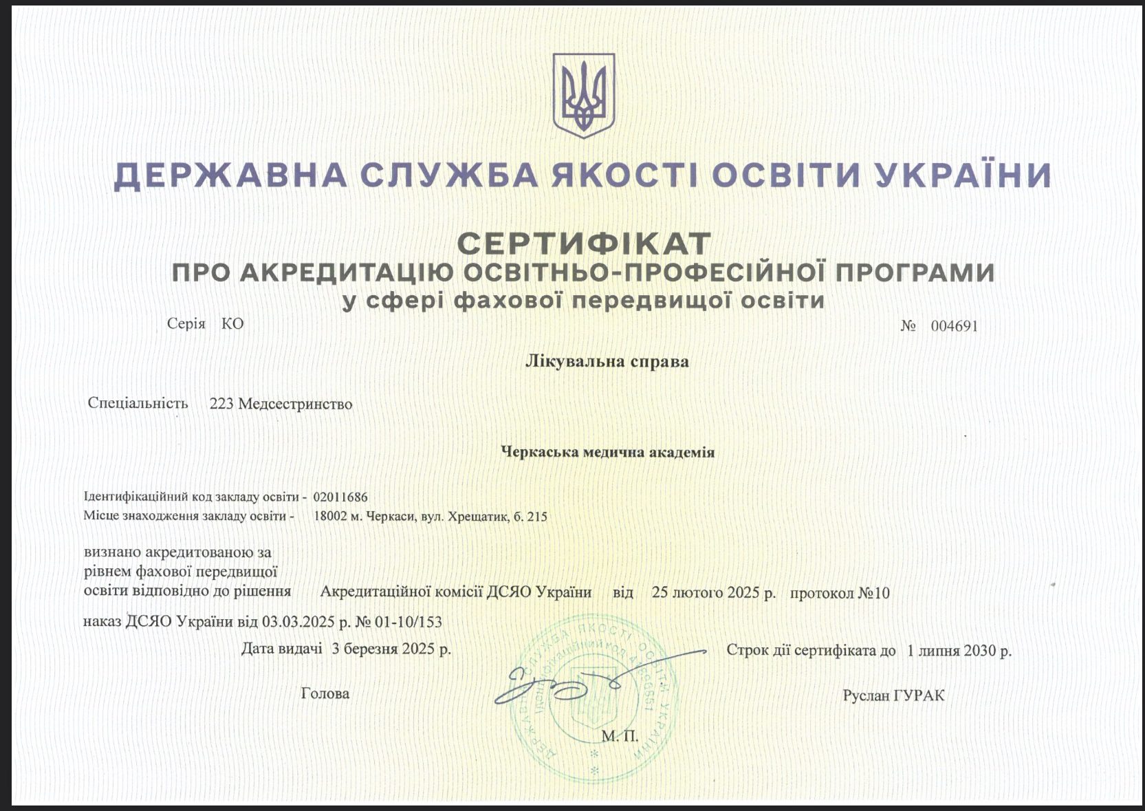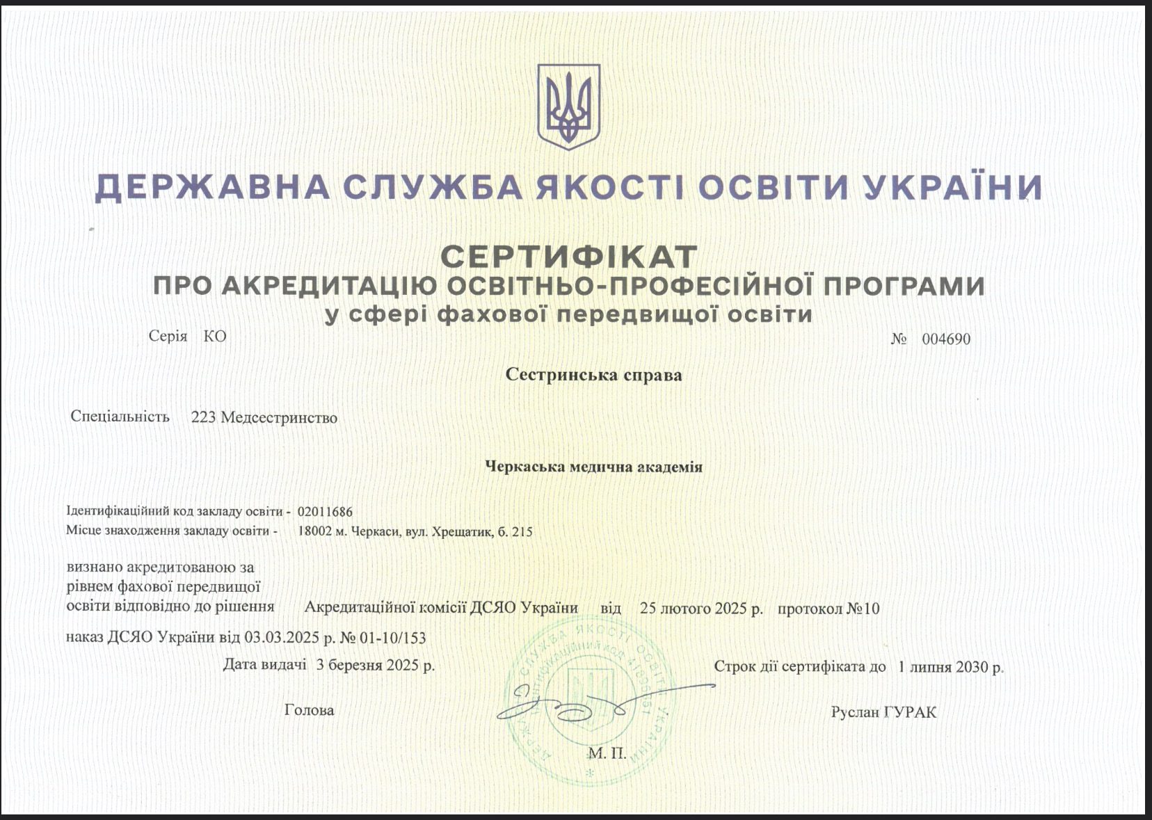 Сертифікат про акредитацію 223 Медсестринство (Лікувальна справа)