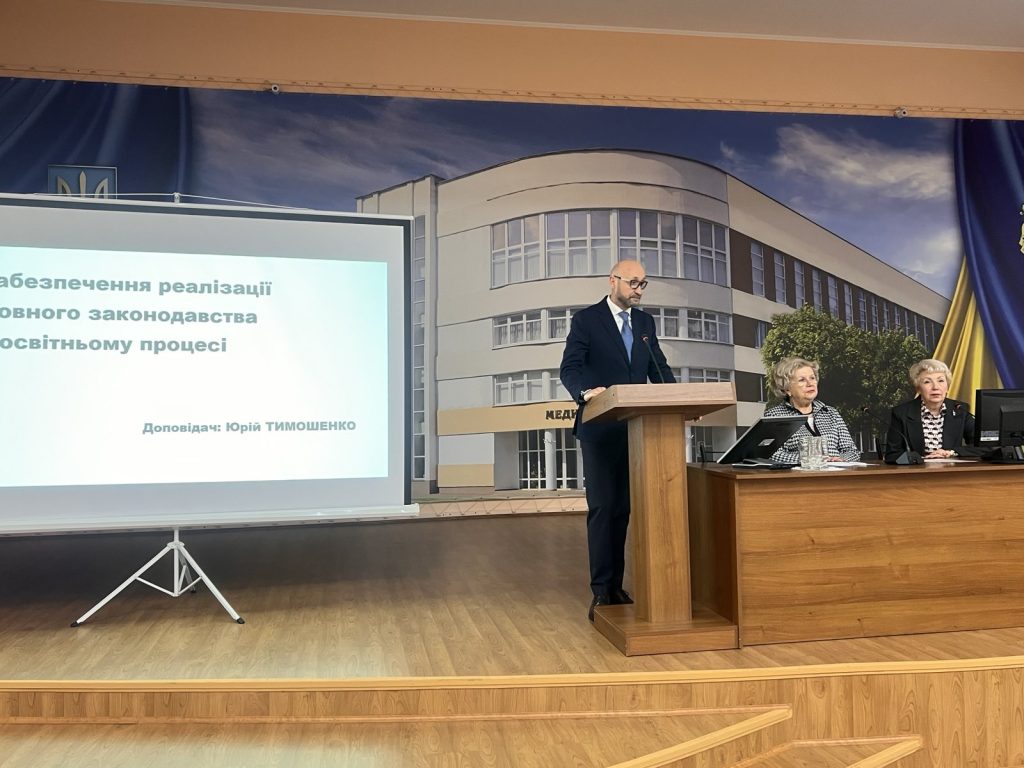 Завідувач кафедри гуманітарних дисциплін, к.філол.н., доцент Юрій Тимошенко проаналізував забезпечення реалізації мовного законодавства в освітньому процесі, зупинився на окремих питаннях редакції нової Українського правопису.
